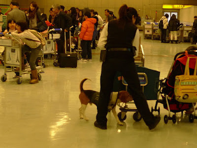 到機場取行李時看見一隻『緝毒犬』正在工作。